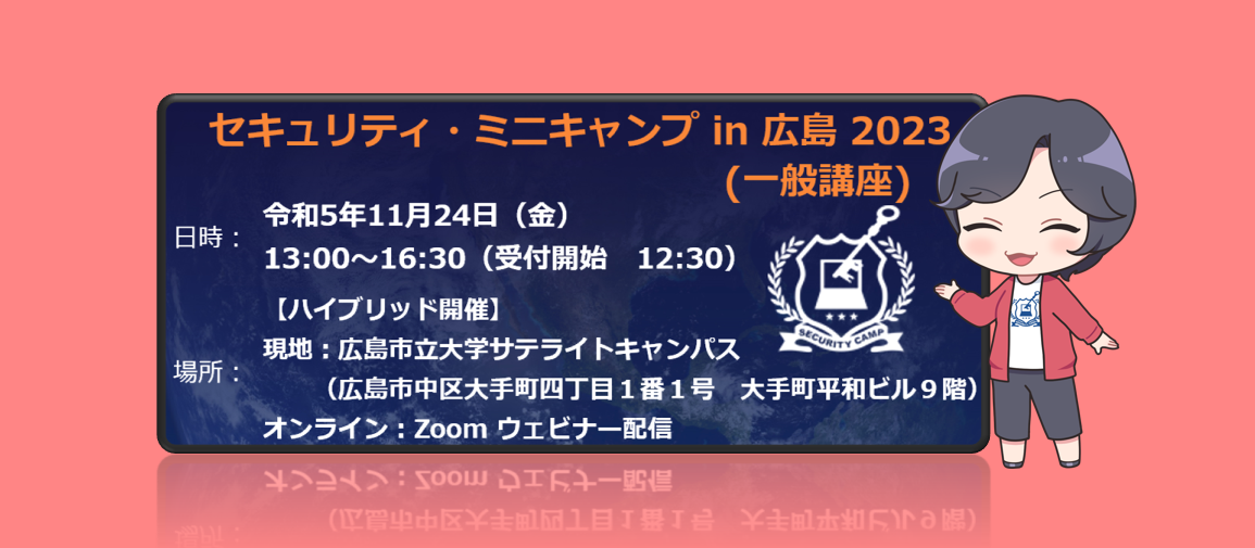 と一般社団法人セキュリティ・キャンプ協議会が主催するセキュリティ・ミニキャンプ in 広島 2023の一般講座の参加者を募集いたします。