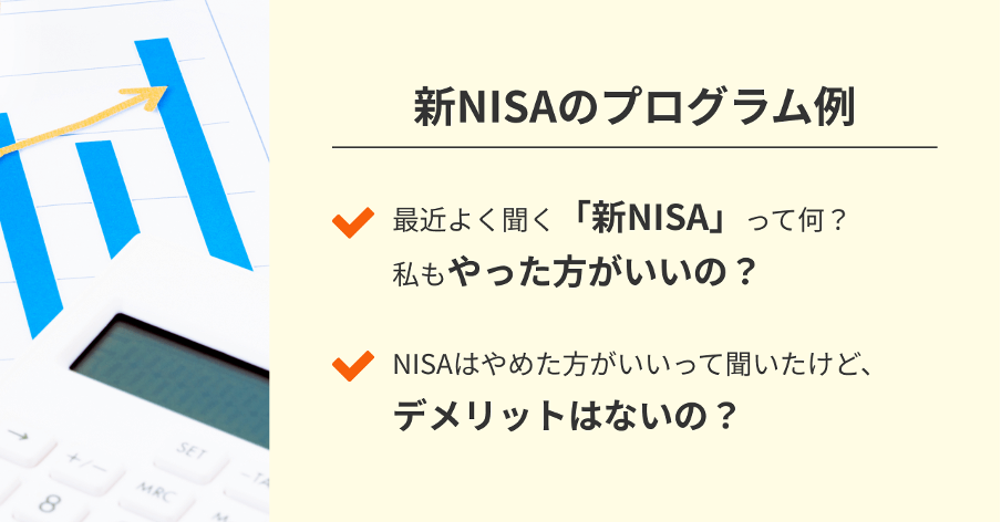 多くの年代の方からご相談を頂く機会が多い「老後資金」「教育費」「新NISA」などのテーマに対し、複数の相談プログラムをご用意しています。