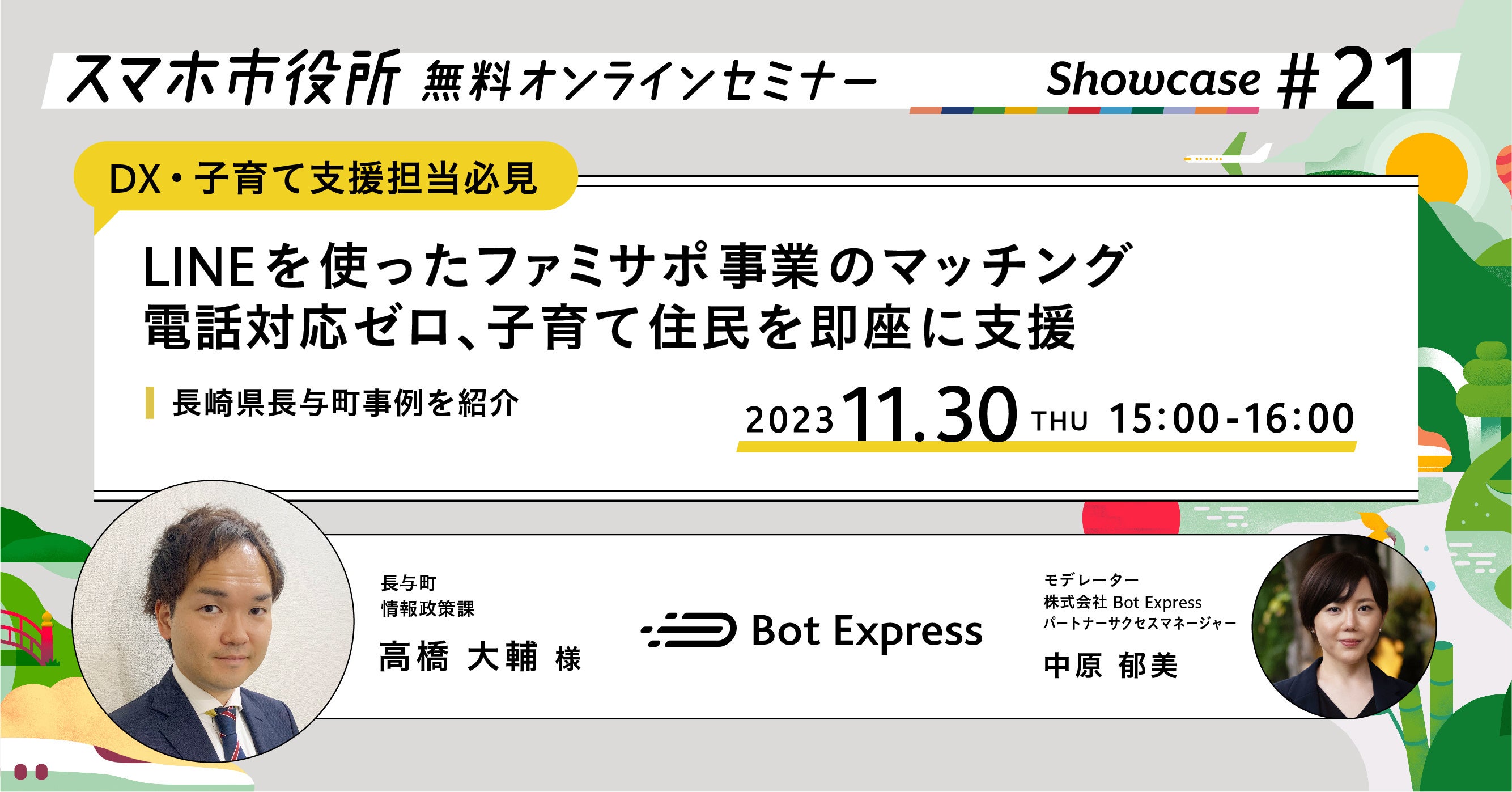 セミナーでは、長与町情報政策課高橋様にご登壇いただき、導入までの流れや運用方法、結果についてご共有いただきます。Bot Expressからは、GovTech Expressのサービス紹介、全国の導入事例、デモを交えた機能紹介を行います。