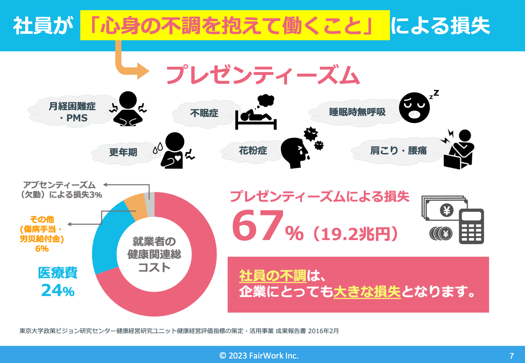 株式会社フェアワークでは、法定ストレスチェック・従業員サーベイ・オンライン社内診療所という3つのSaaSサービスを通じて、これら「会社に出社しているものの、調子が悪い」従業員の見える化と治療まで、一気通貫でサポートしております。