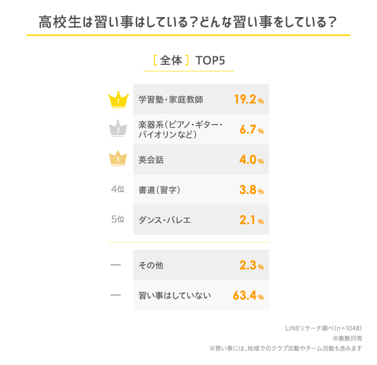 高校生は、学校の部活とは別でどのような習い事をしているのでしょうか。地域でのクラブ活動やチーム活動を含め、している習い事について聞きました。