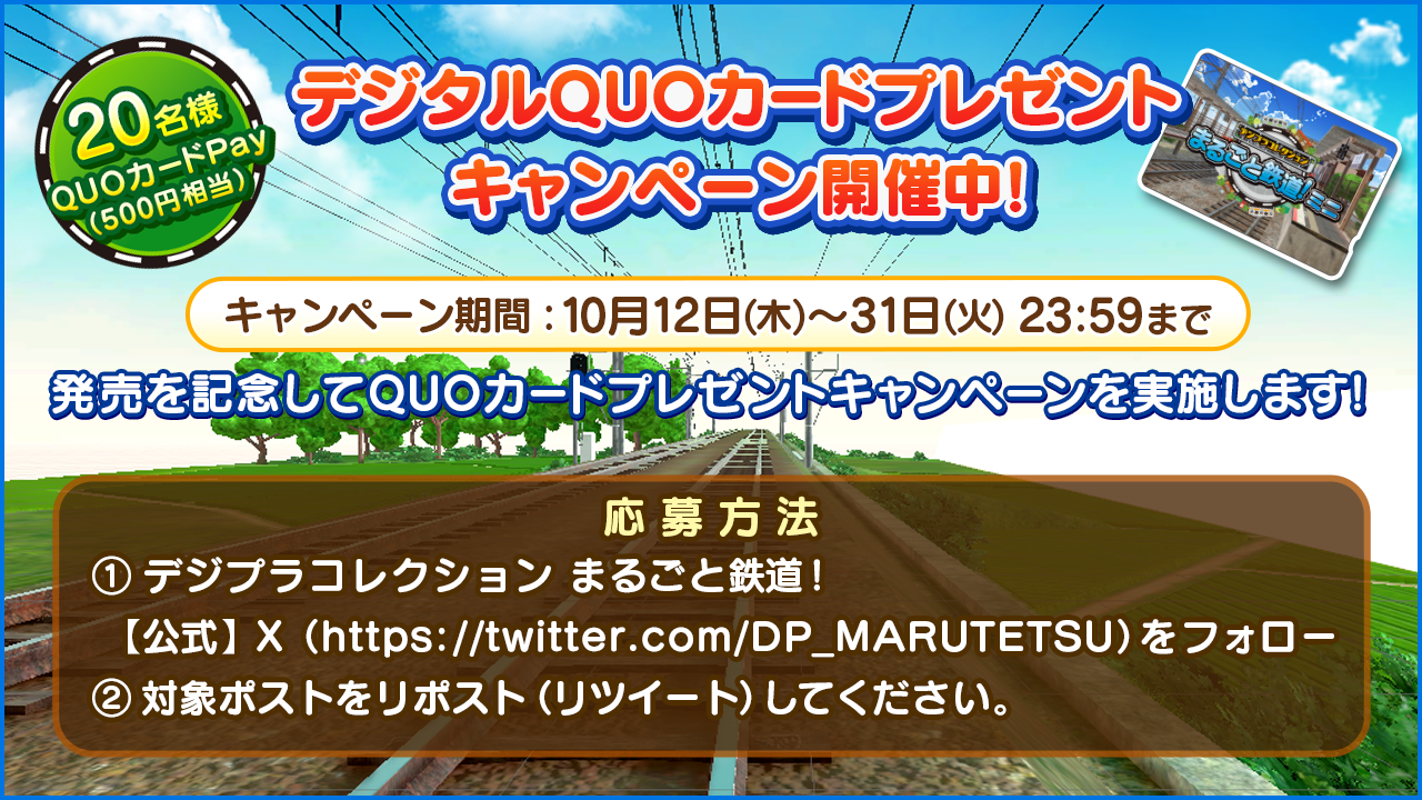 デジプラコレクション まるごと鉄道!【公式】X(旧Twitter)をフォローして、対象ポストをリポスト(リツイート)してください。ポストしていただいた方の中から抽選で20名様にQUOカードPay(500円相当)をプレゼントします。