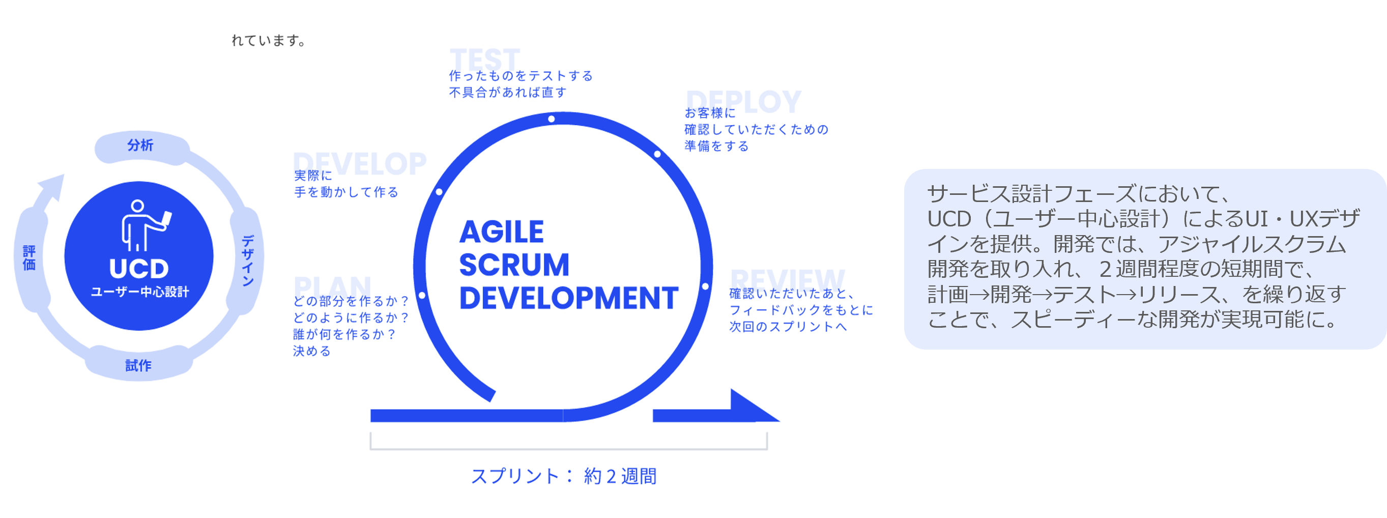 当社の提供するサービスは、日本とベトナムのリソースを融合させ、顧客のビジネスとテクノロジーという両側面からDXを推進する「ハイブリッド型サービス」です。ハイブリッド型サービスにおいては、コミュニケ―ションの仲立ち役である、日本人PMとベトナム人PMの豊富な経験から、従来のオフショアでありがちなコミュニケーションの齟齬などを防ぎます。実際のサービス設計フェーズにおいては、UCD(実際にサービスを利用するユーザーの使い方を元にデザイン・インターフェイスを作成)によるUI・UXデザインを提供し、実装のフェーズではアジャイルスクラム開発を取り入れ、計画、開発、テスト、リリースを繰り返すことにより、高品質かつスピーディな開発を実現します。このように、サービス設計からエンハンスまでワンストップでサービスを提供することで、顧客に貢献いたします。