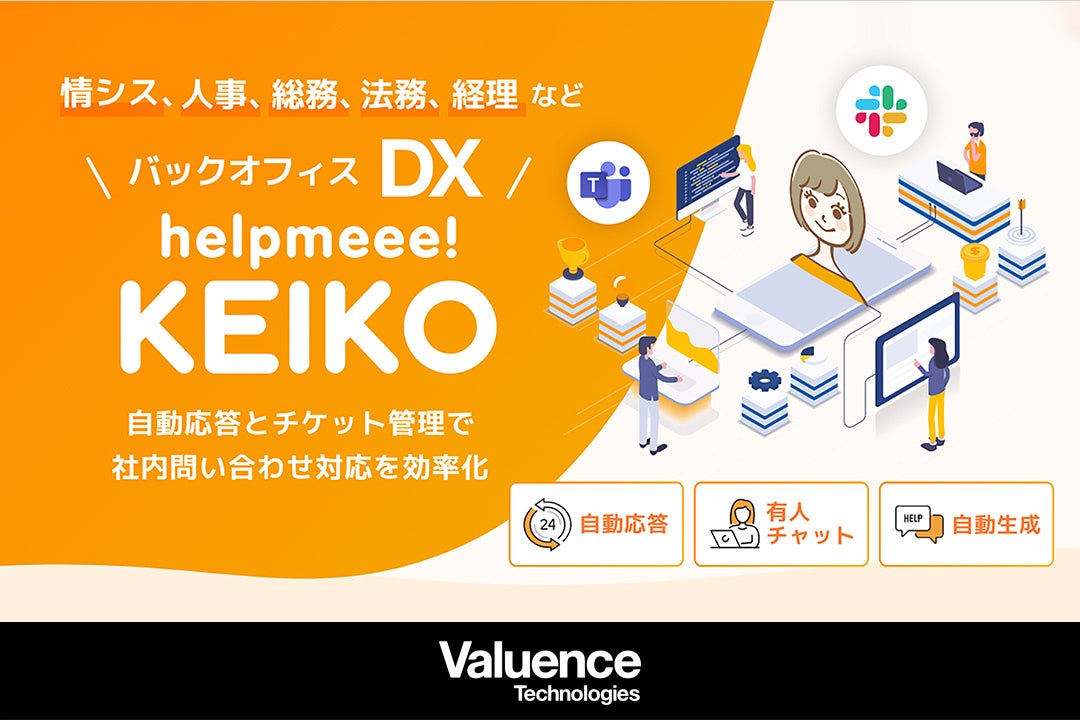 当社が提供するノーコードのバックオフィスDXソリューション「helpmeee! KEIKO」は、AIチャットボットによる自動応答、人間による有人対応、問い合わせチケットの管理、ダッシュボードが統合されており、社内で発生する様々な問い合わせや要望に対して、迅速かつ効率的な対応を可能にし、バックオフィスの効率化・高度化を実現するサービスです。TeamsやSlackにアプリをインストールするだけでご利用いただくことができます。この度、「helpmeee! KEIKO」からフリープランの提供を開始し、あらゆる企業へ高精度のAIおよび高機能のシステムを高度に融合させた本サービスをお届けすることで、業務効率化および高品質化に寄与していきたいと考えております。