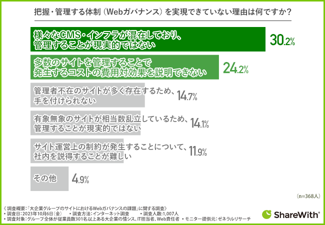 そこで、『実現できていない』と回答した方に、「把握・管理する体制(Webガバナンス)を実現できていない理由は何ですか?」と質問したところ、『様々なCMS・インフラが混在しており、管理することが現実的ではない(30.2%)』と回答した方が最も多く、次いで『多数のサイトを管理することで発生するコストの費用対効果を説明できない(24.2%)』と続きました。