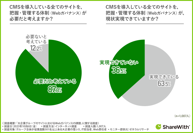 しかしながら、「CMSを導入している全てのサイトを、把握・管理する体制(Webガバナンス)が、現状実現できていますか?」と質問すると、『実現できている(63.5%)』『実現できていない(36.5%)』という回答結果が出ています。