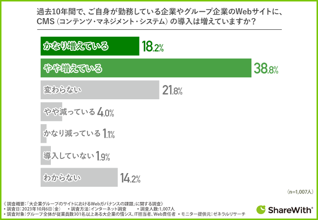 続いて、「過去10年間で、ご自身が勤務している企業やグループ企業のWebサイトに、CMS(コンテンツ・マネジメント・システム)の導入は増えていますか?」と質問したところ、半数以上の方が『かなり増えている(18.2%)』『やや増えている(38.8%)』と回答結果となり、半数以上の大企業でCMSが増加傾向にあることがわかりました。