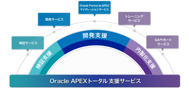 「Oracle APEX」を活用し、APEXの操作性や実現性の検証から、アプリケーション設計・開発、Oracle Forms※1資産のAPEX自動マイグレーション、内製化定着のためのトレーニングとQAサポートまでトータルに提供します。