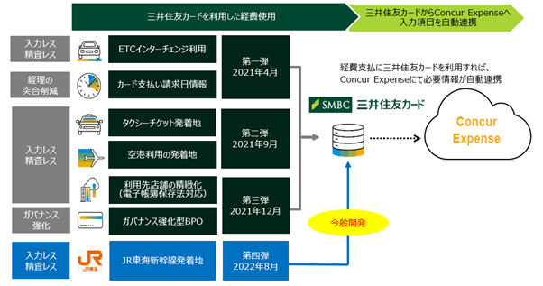 8月末より三井住友カードの三井住友エクスプレスコーポレートカードで、JR東海エクスプレス予約サービスを利用した新幹線の乗車区間や乗車日データ情報を経費精算・管理クラウド「Concur Expense」へ自動連携します。