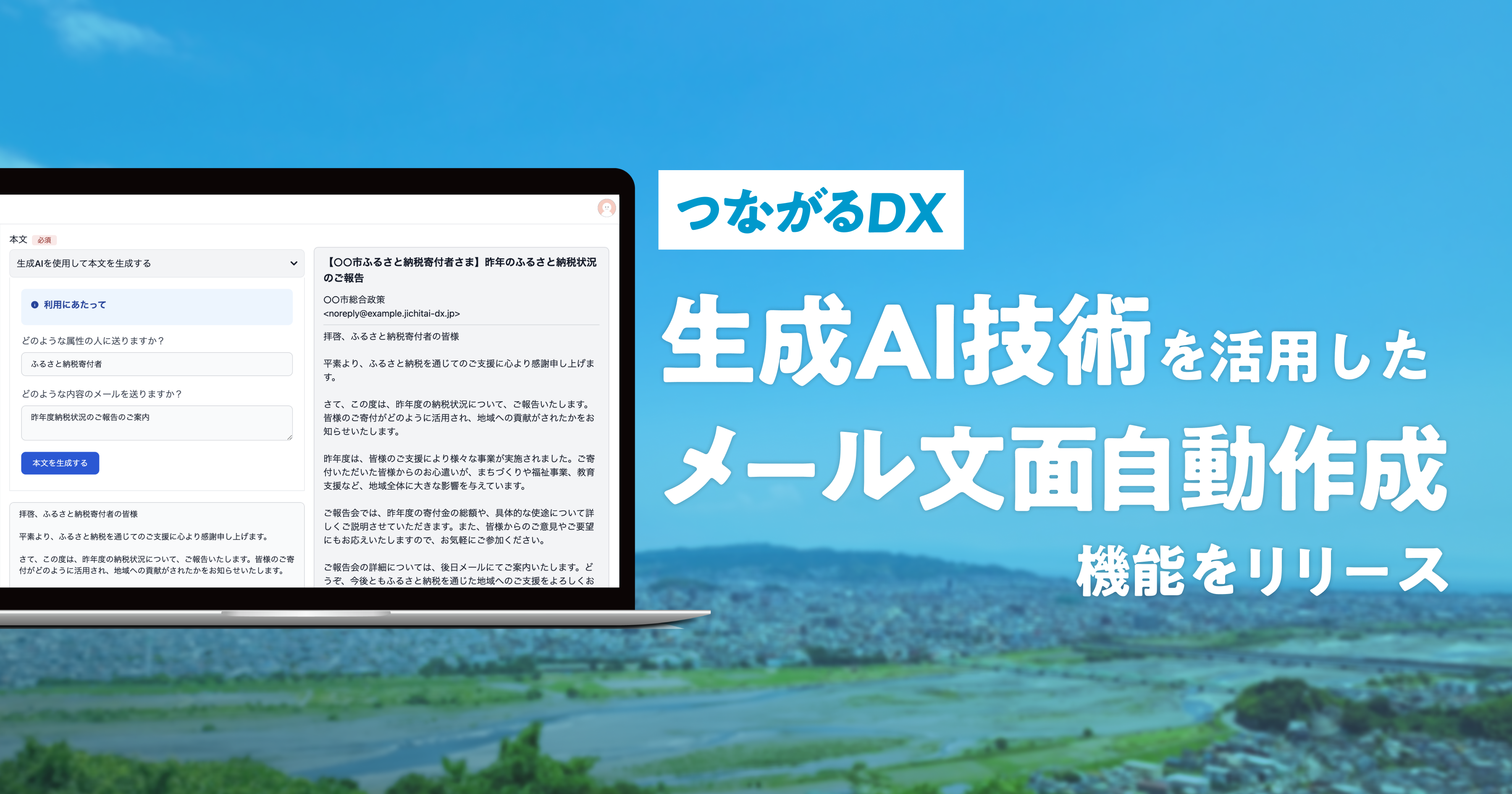 本機能は自治体さまからのご要望をもとに開発を行い、メール配信業務の効率化と効果的な情報発信を両立させることを目的としています。「誰に」「どのようなメールを送りたいか」の条件を入力することで、自動でメールの例文をAIが生成。例文をもとにより短時間で最適なメール作成・配信が可能となり、定期的かつ対象者にあわせた細やかな地域からの情報発信を実現。関係人口とのつながりを育みます。