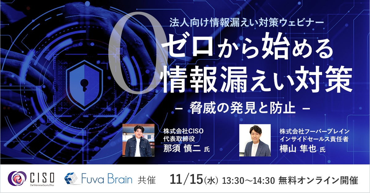 本ウェビナーは、企業向けにセキュリティ診断やセキュリティコンサルティングサービスを提供する株式会社CISOと、クライアントPCのログ取得から情報漏えい対策・セキュリティ対策が可能な「Eye“247” Work Smart Cloud」を提供する株式会社フーバーブレインの2社共催で「ゼロから始める情報漏えい対策」をテーマに、組織内部における脅威の発見と防止の方法についてベストプラクティスや事例を交えて解説します。