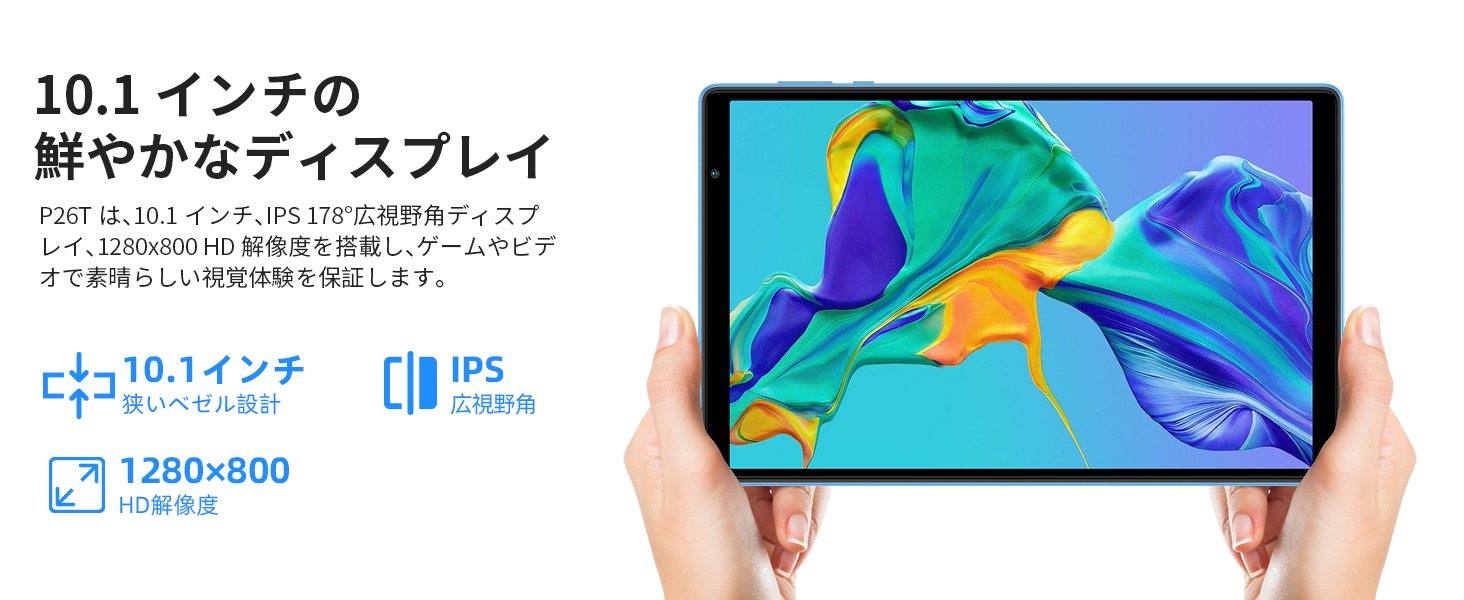 Teclast「P26T」は、10.1インチ、IPS 178°広視野角ディスプレイ、1280×800 HD解像度を搭載し、ゲームやビデオで素晴らしい視覚体験を保証します。6mm幅の超薄型ロングエッジベゼルを採用し、従来の10インチタブレットよりもスリムになっています。背面には、特殊なウェーブパターンのテクスチャーデザインで、手になじみ、滑りにくく、さまざまな光の条件下で光を反射させることができます。