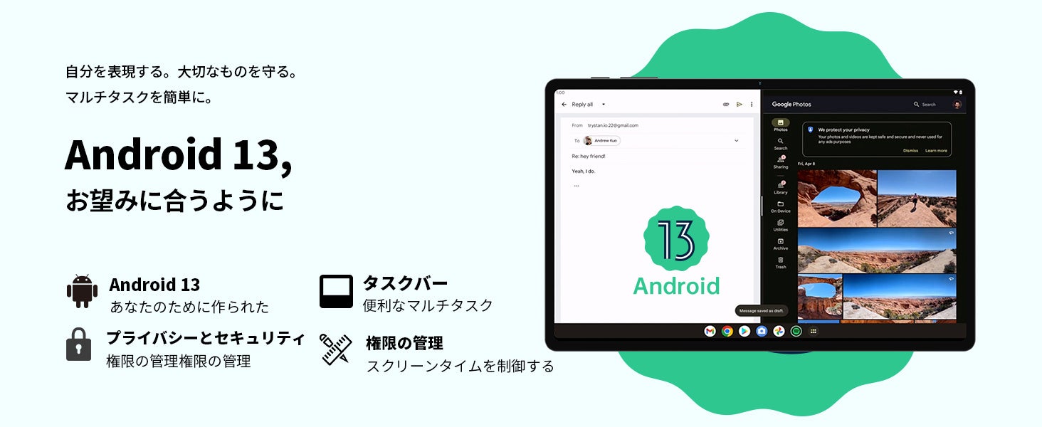 10インチ / Android 13 / 8GB(4+4GB拡張)RAM+128GB ROM+1TB拡張 / WideVine L1対応 / WiFiモデル / デュアルカメラ / 画面分割 / 3.5mmヘッドフォンジャック / 児童守護