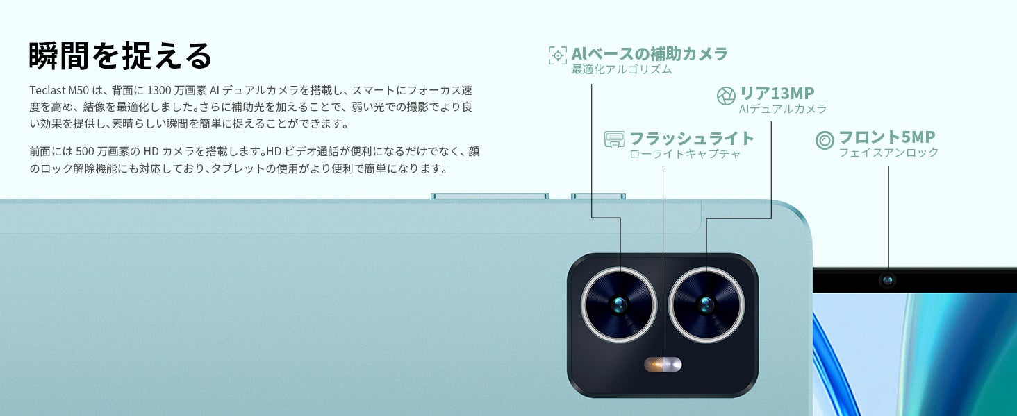 Teclast M50は、背面に1300万画素AIデュアルカメラを搭載し、スマートにフォーカス速度を高め、結像を最適化しました。さらに補助光を加えることで、弱い光での撮影でより良い効果を提供し、素晴らしい瞬間を簡単に捉えることができます。 前面には500万画素のHDカメラを搭載します。HDビデオ通話が便利になるだけでなく、顔のロック解除機能にも対応しており、タブレットの使用がより便利で簡単になります。