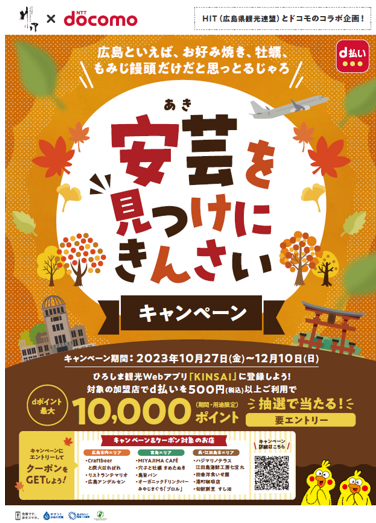 ①期間中KINSAIへの会員登録と、キャンペーンサイトからのエントリーのうえ、対象エリア(広島市・廿日市市・呉/江田島市)のd払い加盟店にてd払い(コード決済)で1回500円(税込)以上お支払いされたお客さまに対して、抽選でdポイント(期間・用途限定)を最大10,000ポイント進呈いたします。
