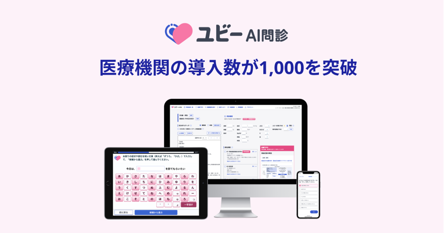 2017年サービス提供を開始した「ユビーAI問診」は、紙の問診票のかわりにスマートフォンやタブレットを活用した、医療機関の業務効率化のための問診サービスです。医師は、カルテ記載に伴う事務業務の削減により、患者さんと向き合った診療により一層集中でき、患者さんは、診察前の時間を活用し自身の症状を詳しく伝えられるようになります。働き方改革への意識が高まる全国の急性期病院を中心に導入数を伸ばし、その後コロナ禍での滞在時間短縮や来院前の事前トリアージなど、患者さんやスタッフの安心・安全対策を目的とした業務効率化観点でクリニック・診療所など「かかりつけ医」でも導入が広がっています。