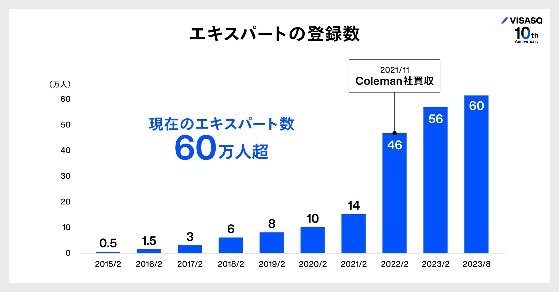 さらにグローバルな成長を加速させるため、2021年11月には米国同業のColeman Research Group, Inc.(以下、Coleman社)を買収いたしました。Coleman社のデータベースが加わったことで外国人エキスパートのデータベースは一気に拡充し、2023年8月時点で当社の知見データベースは190カ国60万人に到達しております。