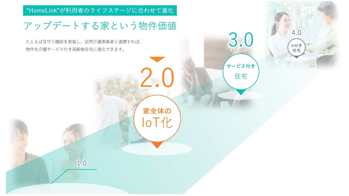 2060年頃には国内人口の2.5 人に1 人が65 歳以上※2 という超高齢化社会になると言われ、福祉施設や介護従事者の不足が予想されます。「HomeLink 」アプリはヘルスケアサービスにも対応し、住宅のリノベーションに併せて安否確認センサーやナースコール、宅食サービス、24 時間365 日見守りサービスなどを導入することで、自宅を高齢者施設と同等の機能にアップデートすることも可能です。物件オーナー様が安心して暮らせる100 年住宅を実現します。