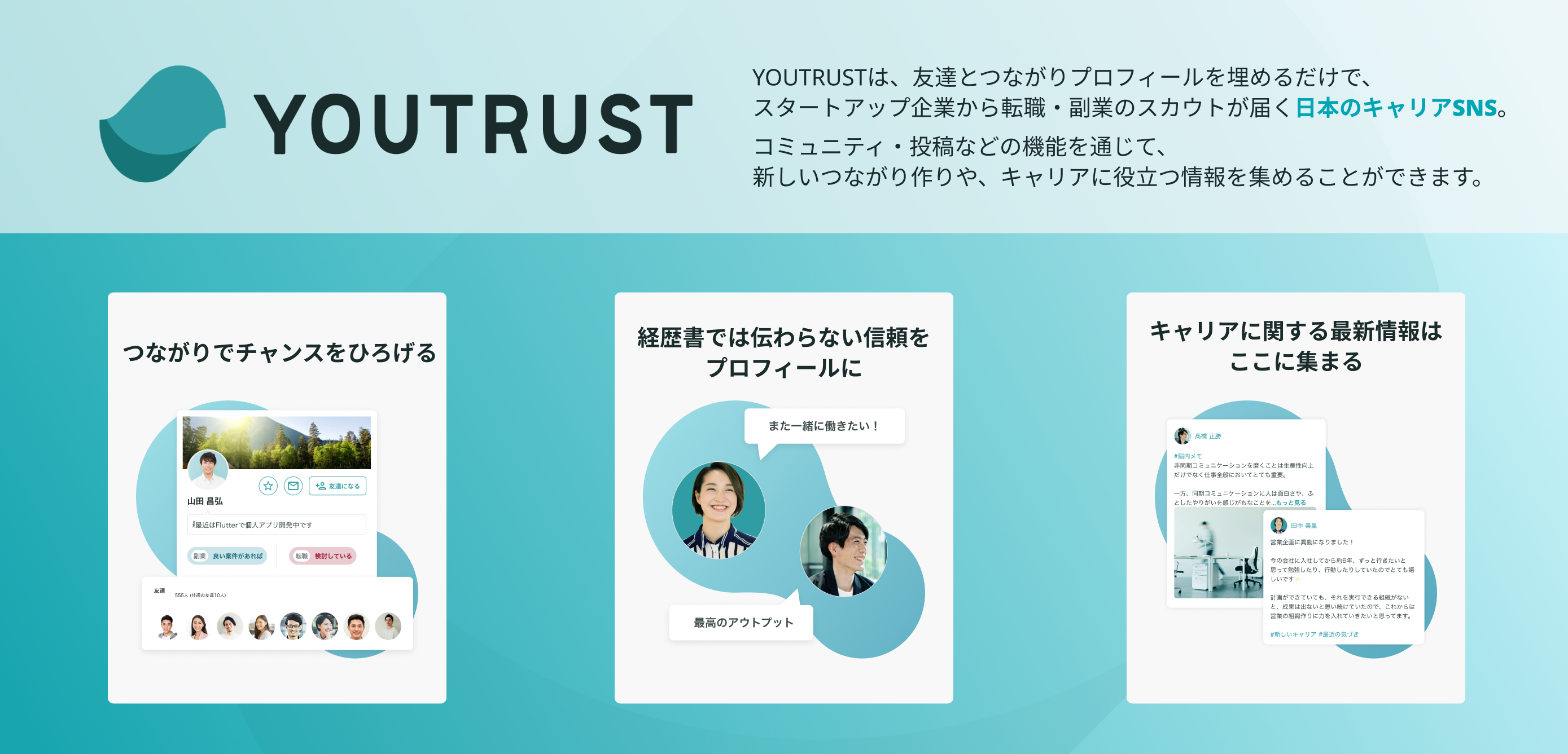 YOUTRUST(ユートラスト)は友達とつながりプロフィールを埋めるだけで、スタートアップ企業などから転職・副業のスカウトが届く日本のキャリアSNS。コミュニティ・投稿などの機能を通じて、新しいつながり作りや、キャリアに役⽴つ情報を集めることができます。