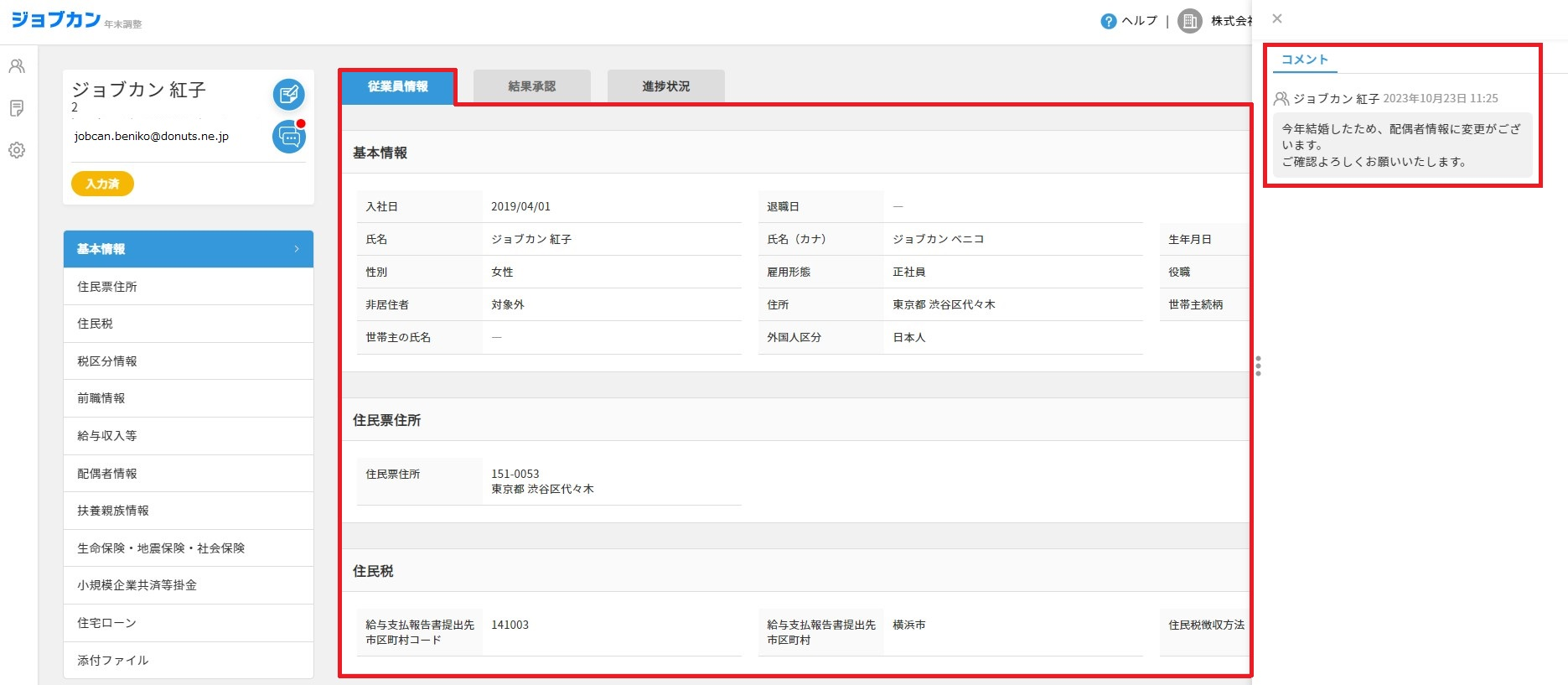 従業員情報の画面では、該当の従業員に関する詳細情報はもちろん、メモや、やり取りをしたコメントも一画面で確認することが可能になりました。複数の管理者で年末調整を行う場合にも、情報の確認漏れなどを防ぐことができます。