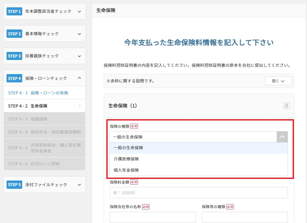 さらに、生命保険料控除の区分切替機能の実装により、「一般の生命保険」「介護医療保険」「個人年金保険」の3つに関して、プルダウンで区分切替を行うことが可能になりました。入力したデータを保持したまま切り替えることが可能なため、区分を間違えた際にも再度入力する手間がなくなります。