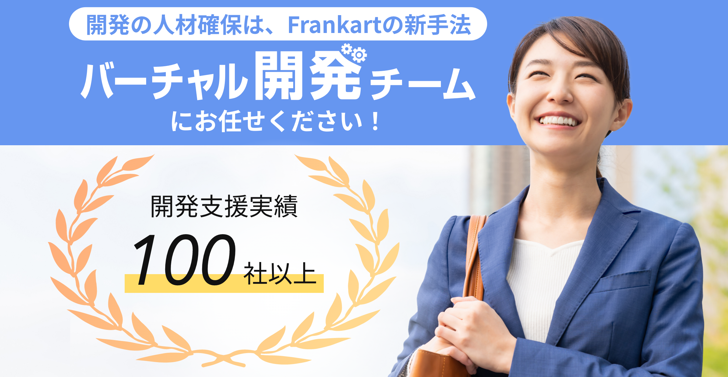 『開発を手軽に安心に。』をコンセプトに掲げ、数多くの開発をバックアップしてきたフランクアート株式会社(代表取締役:井上幹郎、以下フランクアート)が、以前より提供を行なっている「バーチャル開発チーム」をリニューアルしました。CTO採用・ChatGPT活用・IT新規事業などへ向けてサービス内容を拡充し、より柔軟な開発支援を行います。