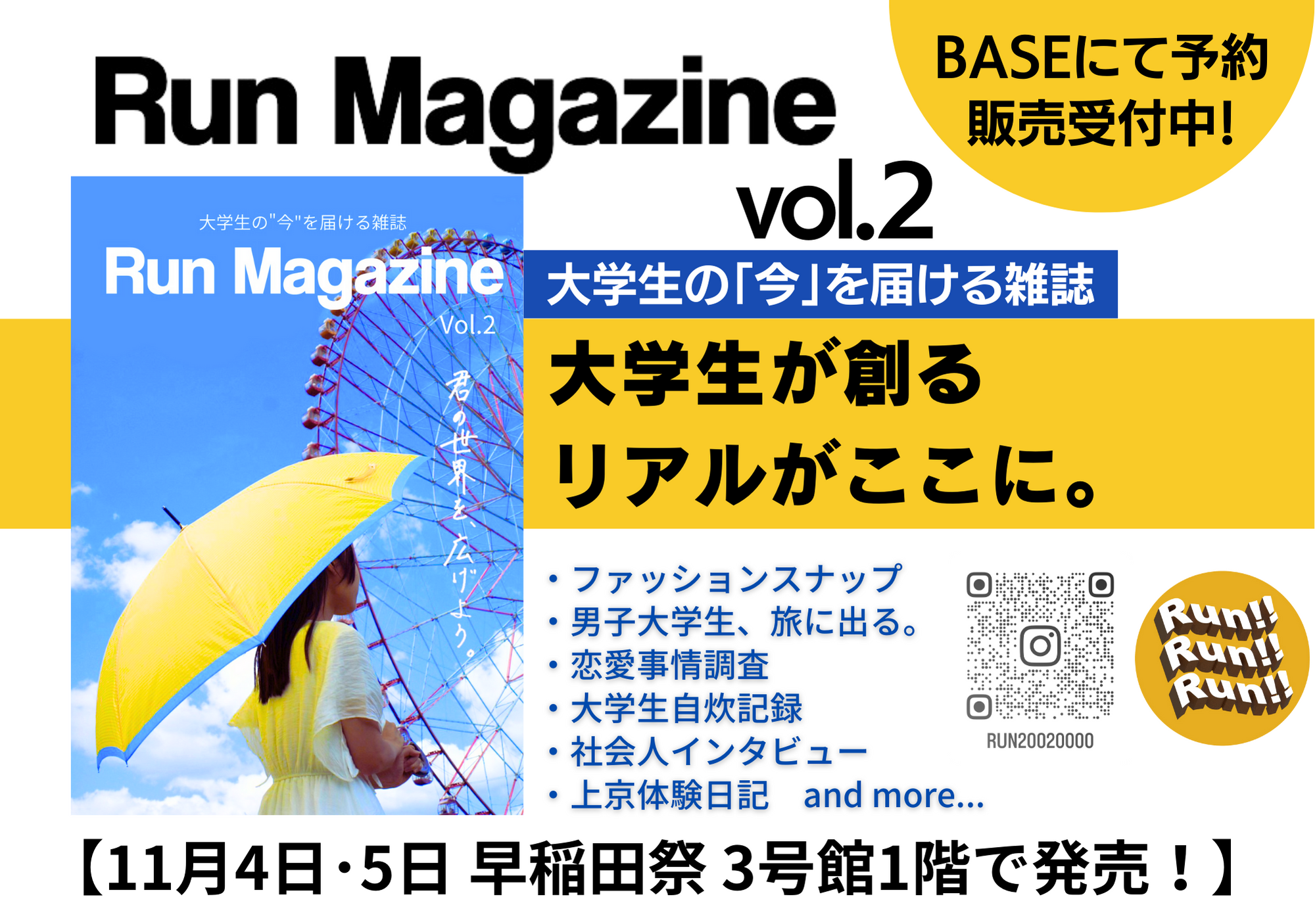 授業・サークル・恋愛・私生活 etc.大学生のリアルな“今”がここに。進化した「Run Magazine vol.2」を、ぜひご覧ください!