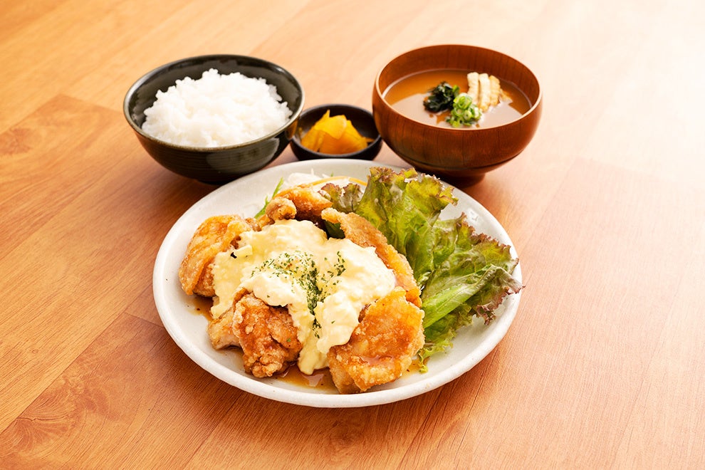 看板メニューは「自家製タルタルのチキン南蛮定食」。あつあつ揚げたての鶏もも肉に甘酸っぱい南蛮酢を絡めて旨味を染み込ませ、毎日お店で丹念に手作りしている自家製タルタルソースで仕上げます。バラエティ豊かな定食メニューとごはんおかわり自由で、おなか一杯の幸せを提供します。