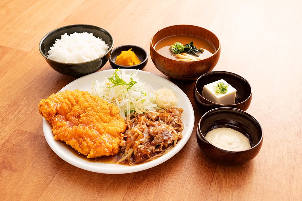 ・鶏むね肉を使用したヘルシーなチキン南蛮と、豚バラ肉のこってりとした生姜焼きを合わせたダブルメインのボリューム満点の定食です。