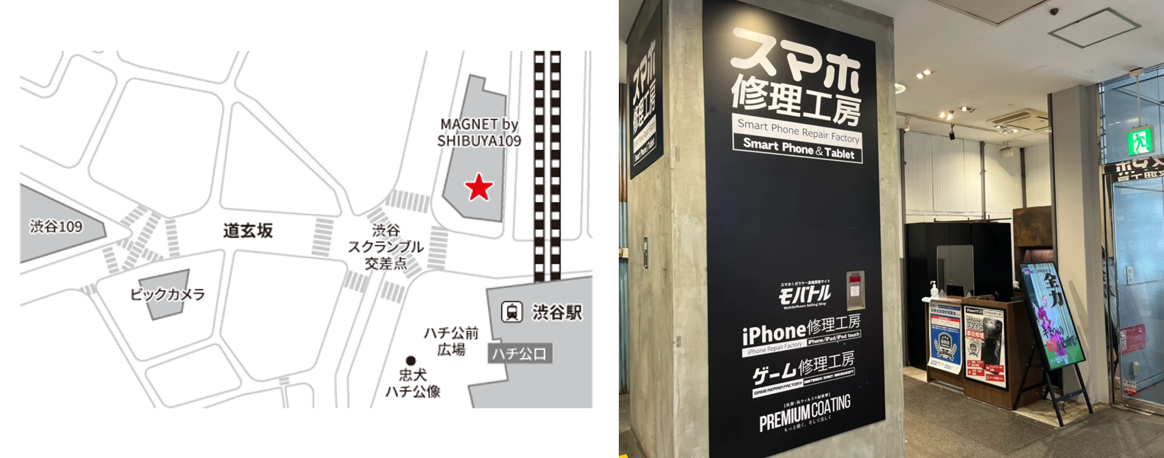 渋谷エリアでは現在、渋谷マークシティ4階の「クリエーションスクエアしぶや」、渋谷フクラス1階の観光案内所「shibuya-san」の2カ所にWiFiBOXの設置をしております。JR渋谷駅ハチ公口から徒歩約1分に位置するMAGNET by SHIBUYA109の1階に入る「スマホ修理工房 渋谷店」への設置により、JRや東京メトロおよび東急線の渋谷駅や宮益坂エリアに近い場所での受取・返却が可能となります。