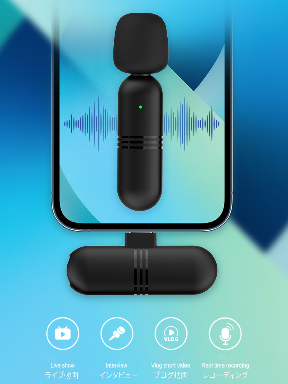 スマホ(Lightningポート)に接続し、マイクの電源を入れるだけで簡単に使用可能です!