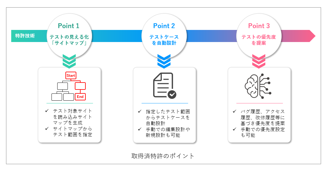 今回特許を取得した「テスト支援プログラム、テスト支援装置、ならびにテスト支援方法」は、テスト対象であるソフトウェアの見える化「サイトマップ」、サイトマップからテスト自動設計、テスト優先度の提案に関する技術を備えています。