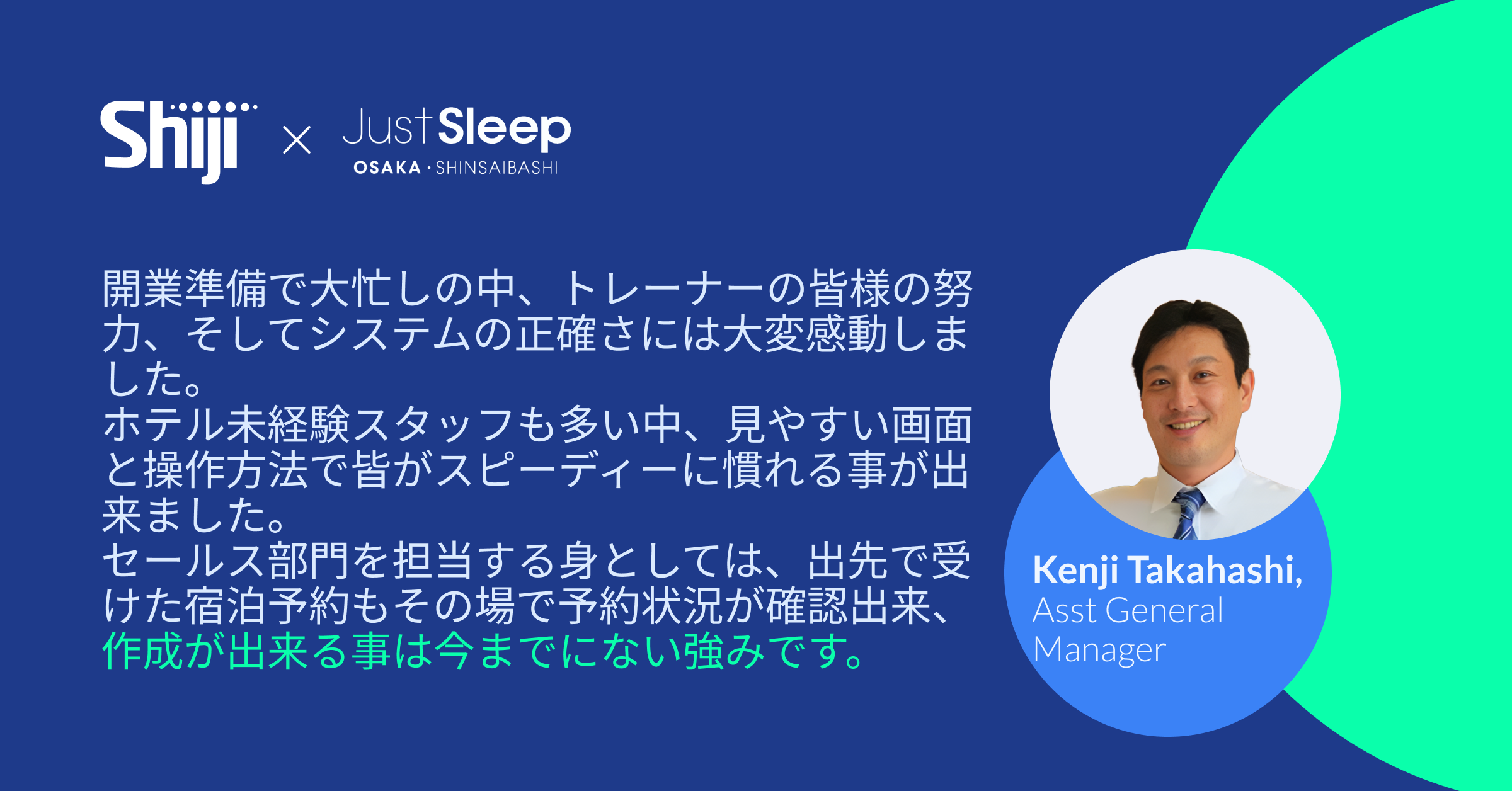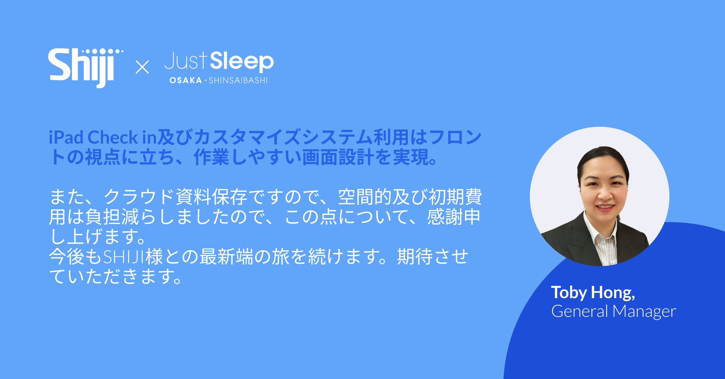 ジャストスリープ大阪心斎橋様は当社のShiji エンタープライズ・プラットフォームを導入していただいた、日本で最初のホテルです。2023年3月1日の開業から今日までホテル運営の基幹となるシステムをご活用いただき厚く御礼申し上げます。またホテルチームの皆様より心温まるコメントを頂戴し、感動しました。私共は今後も誠心誠意ホテル運営をサポートさせていただく所存でございます。 2023年10月27日 笹峯 清