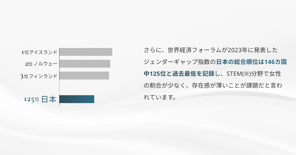 さらに、世界経済フォーラムが2023年に発表したジェンダーギャップ指数の日本の総合順位は146カ国中125位と過去最低を記録し、STEM(※)分野で女性の割合が少なく、存在感が薄いことが課題だと言われています。