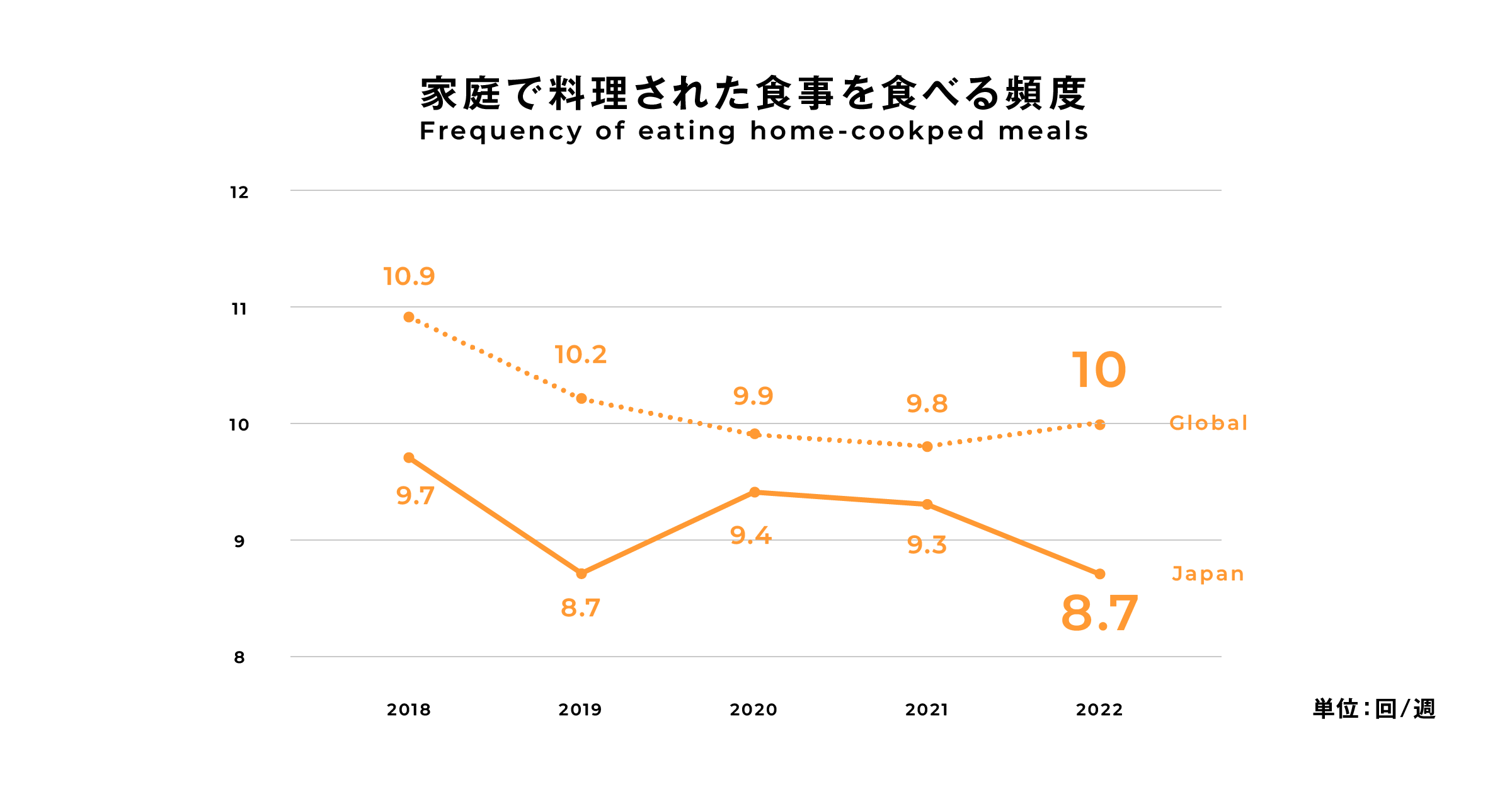 ・日本では昨年比 +0.6回 の8.7回/週で、2020年の9.4回/週、2021年の9.3回/週を下回った