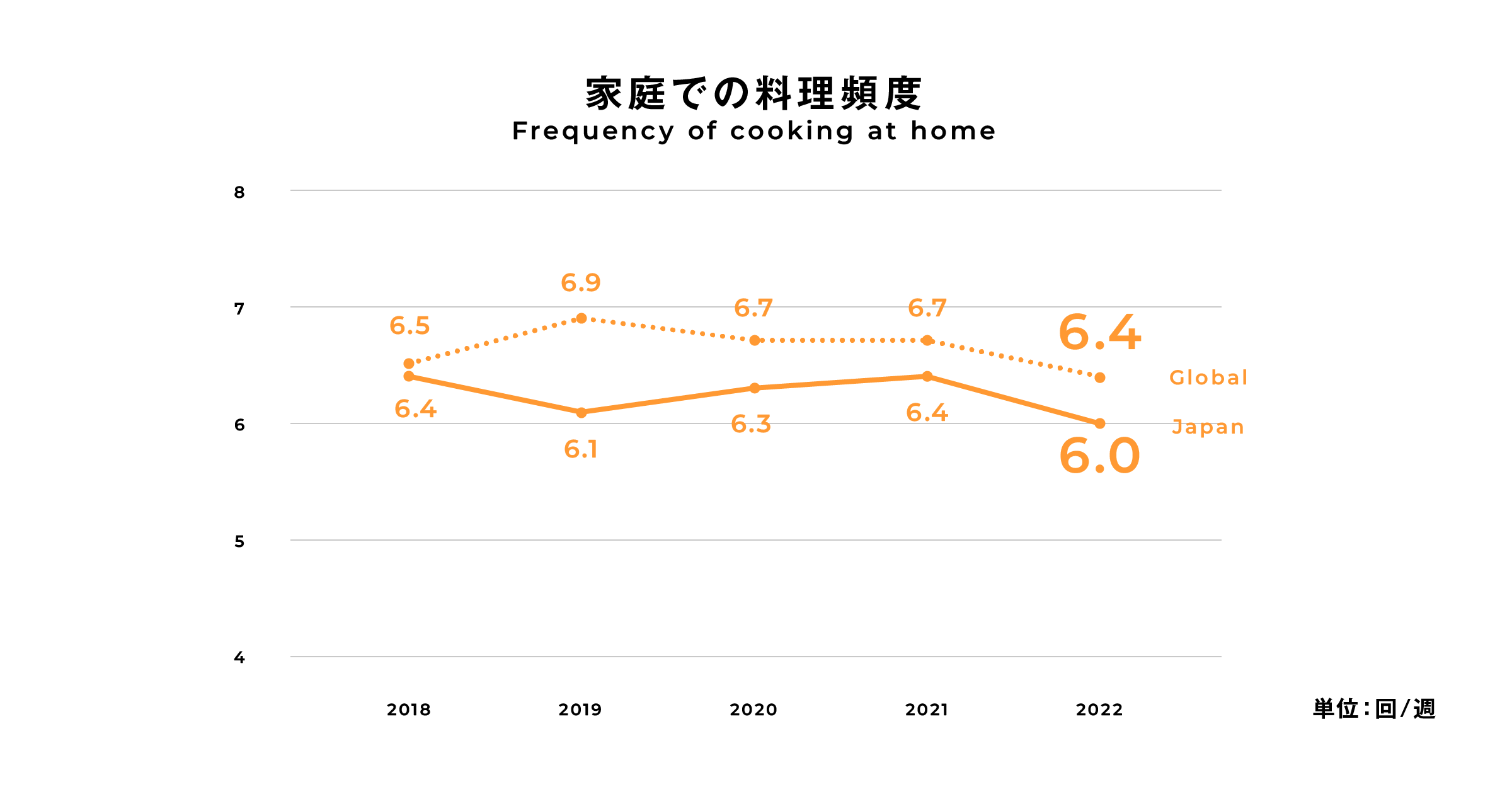 ・料理頻度のグローバル平均は昨年比 -0.3回の6.4回/週で、2018年の調査開始以降最低水準