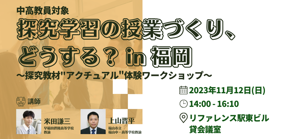 今回のワークショップでは、まずは探究学習のトレンドと現在学校が抱える課題を、文部科学省や経済産業省等省庁で委員を務める米田謙三教諭にご共有いただき、その後生徒主体の学びに長年取り組まれてきた上山晋平教諭による”アクチュアル”の模擬授業を通して、生徒が主体的に動く授業づくりのあり方をご参加の皆さまに体験していただきます。