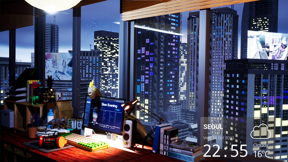 本作品は、大学やスクールの校舎がある都市や留学生の出身国など、デジタルハリウッドに縁がある様々な場所の天候やライブカメラ視聴者数などのデータを利用したリアルタイム映像です。各データと連携して映像内の夜景に変化が起きます。「残業中、他の会社のビルの明かりに勇気づけられる」という制作チームの体験をもとに、作業仲間の気配を感じることのできる表現を目指しました。Firebase、GoogleAppsScript、UnrealEngine、Electron、TouchDesignerなどを活用したエンジニアリングが施されています。(詳細は後述の解説をご確認ください)