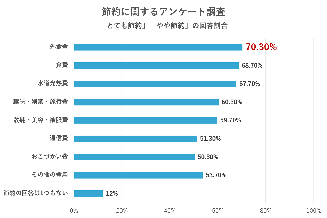 2023年1月にアイスタット社が実施した、節約に関するアンケート調査※1では、節約しているもの・心がけているものの項目で、「外食費」と回答した割合が38.7%と最も多く、「とても節約」「やや節約」まで足した割合でも70.3%と全項目での最多を占めました。