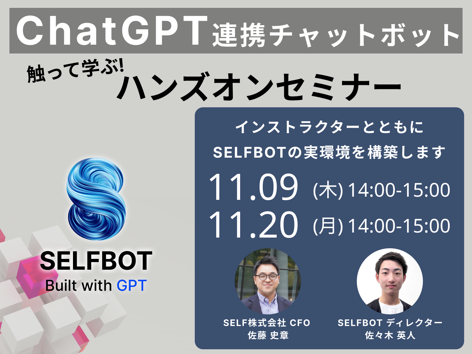 この度、ChatGPTを社内利用 / 顧客対応を目的として導入検討している企業様向けにSELFBOTを無料で体験いただけるハンズオンセミナーを開催します。