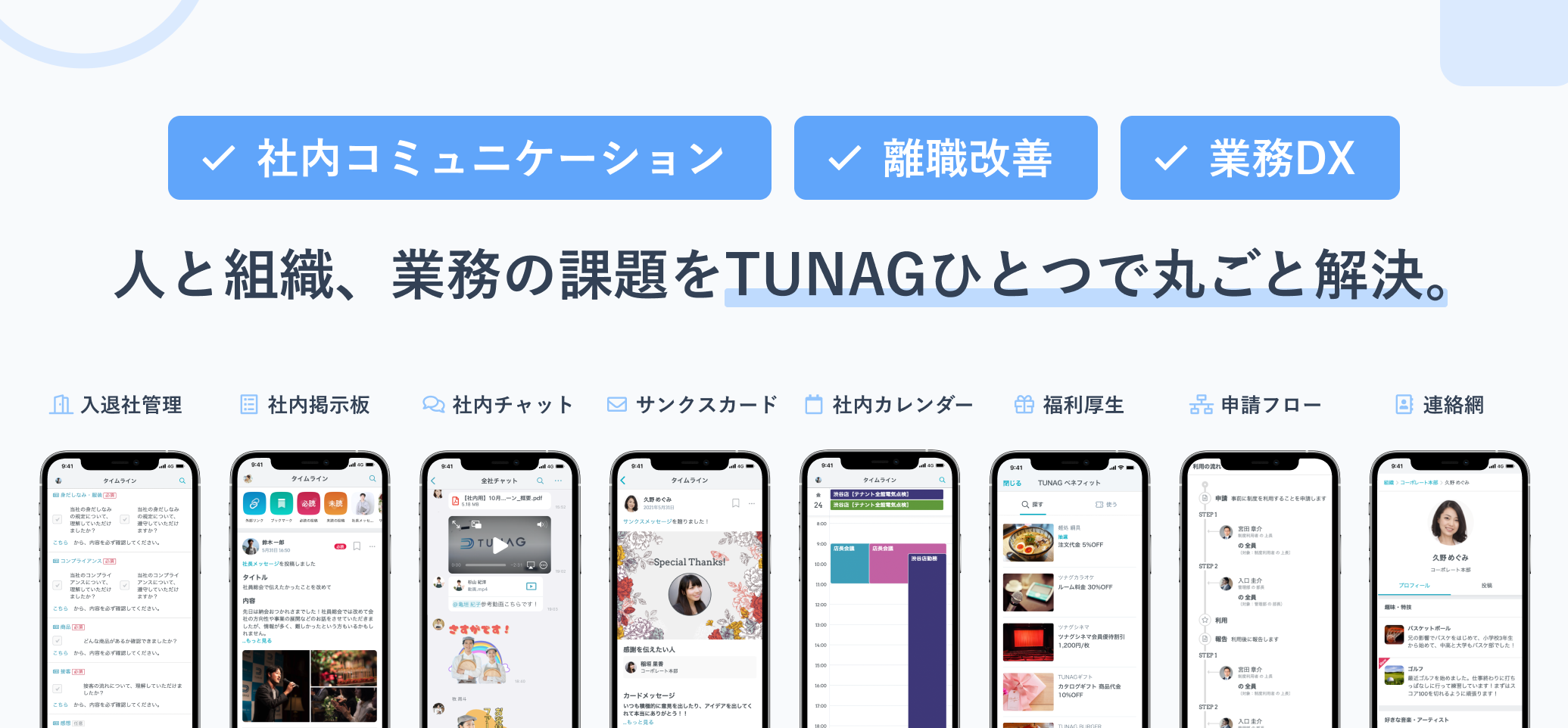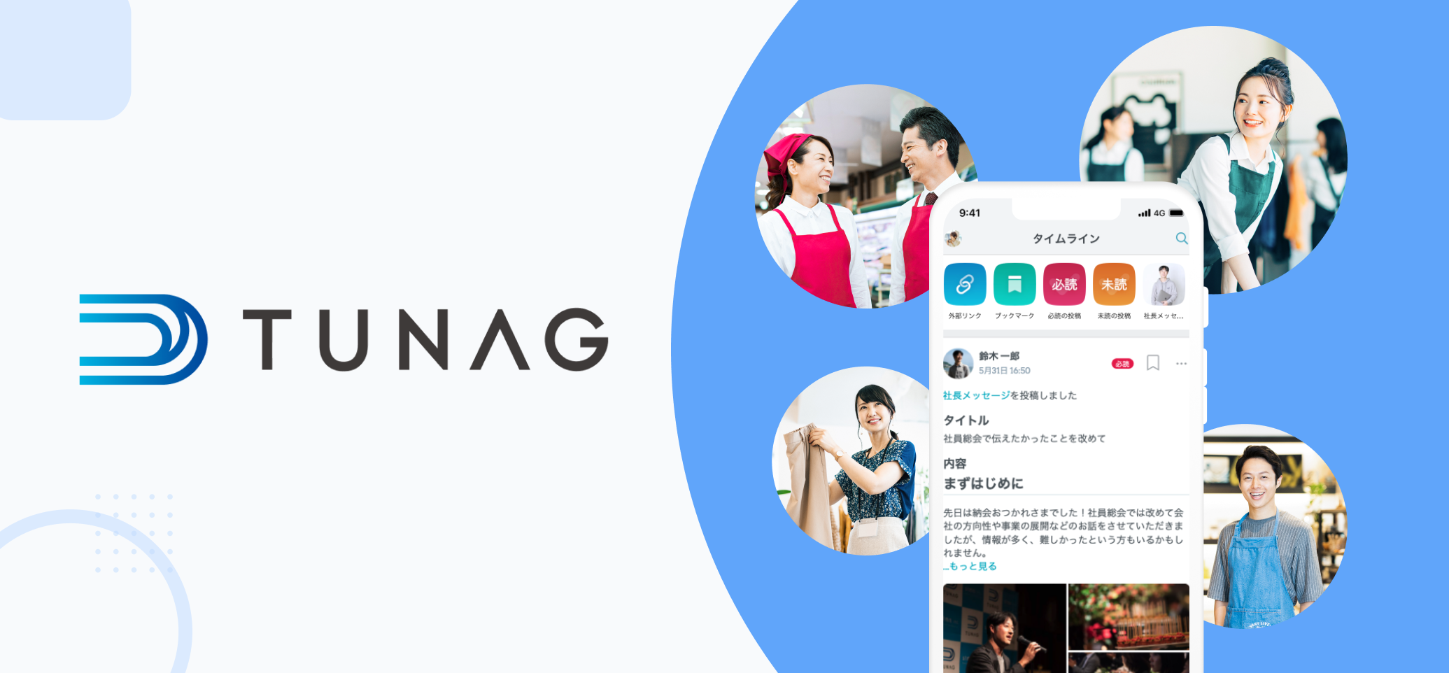 TUNAG(ツナグ)は、アルバイトを含む従業員の定着率向上や情報共有の促進、業務DXで、安定した組織運営を実現する社内アプリです。各社の組織課題の解決に最適な施策を設計・運用・改善できる高いカスタマイズ性と、弊社専任スタッフによる導入・活用支援により、強い組織づくりを支援します。また、社用PCや法人メールアドレスを持たないアルバイト・現場社員でも利用しやすいよう、スマホアプリに最適化されています。規模や業種、業態を問わず700社以上の企業でご導入いただき、50万人を超えるユーザーにご活用いただいています。