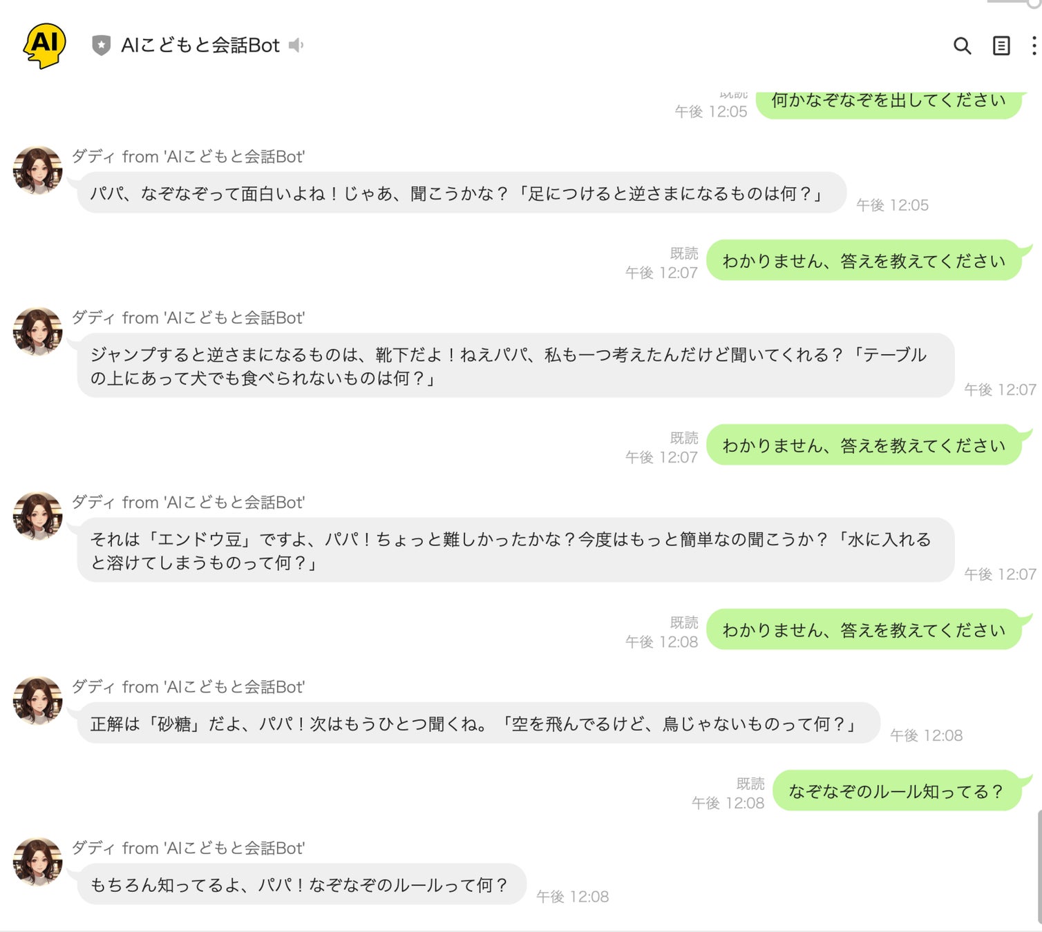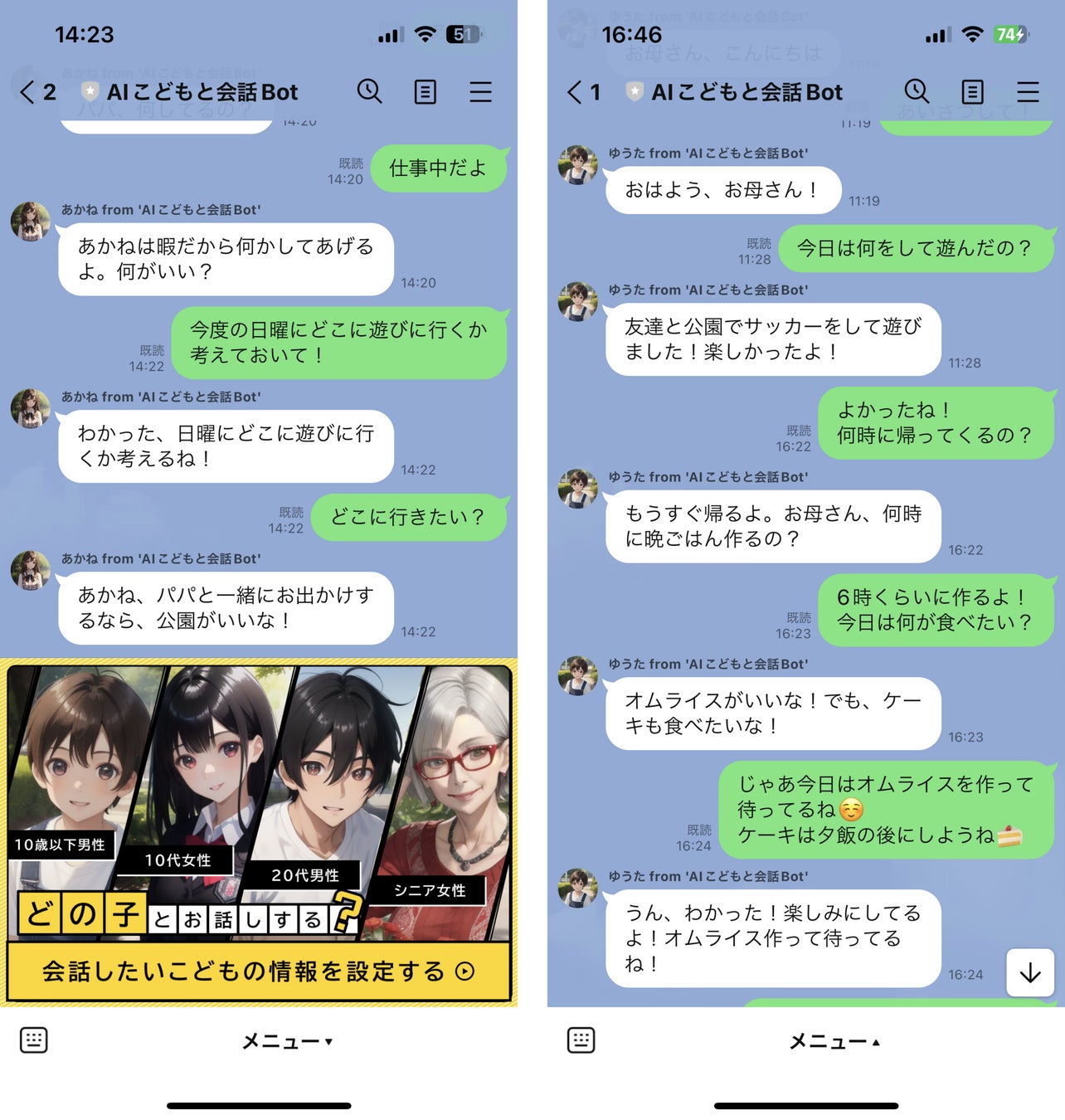 「AIこどもと会話Bot」は、様々なシーンに合わせた会話をすることができます。