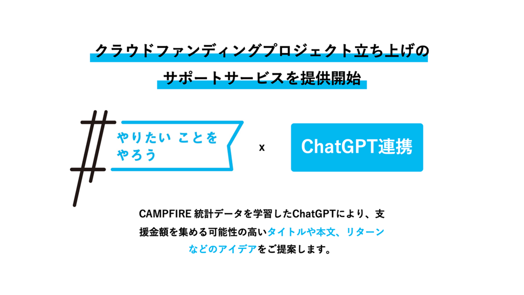 ご記入いただいた内容をもとに、CAMPFIRE 統計データ(https://camp-fire.jp/stats)を学習したChatGPTにより考案されたクラウドファンディングプロジェクトのタイトルやリターン等のアイデアをサポートメールとしてお送りいたします。なおメールが届くまでに、数分ほどかかる場合がございます。