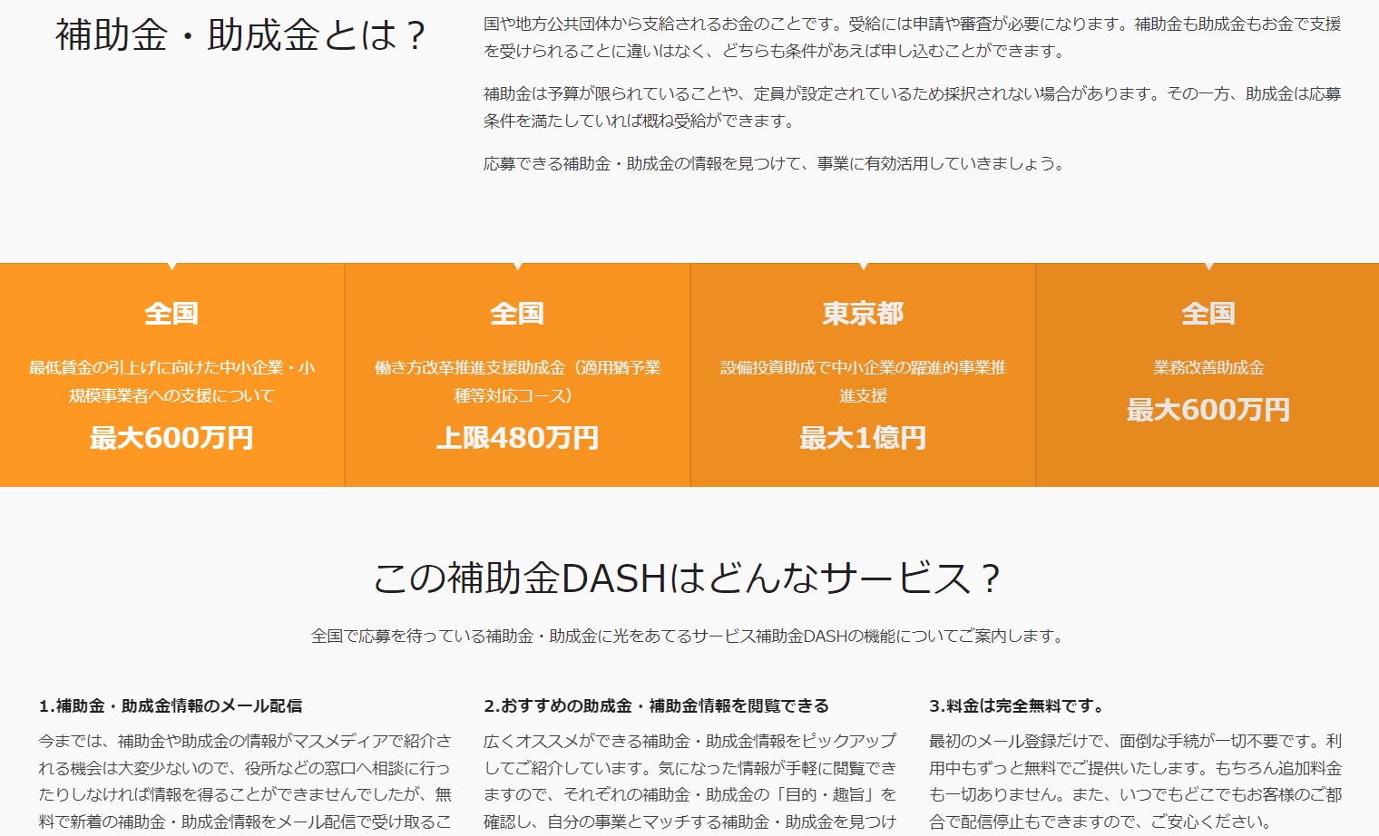 2023年8月1日からサービスを開始した「補助金DASH」は、当日に掲載された補助金・助成金など、事業者に資金の一部を給付する情報を集めて、最新の情報をメール配信で無料提供するサービスです。