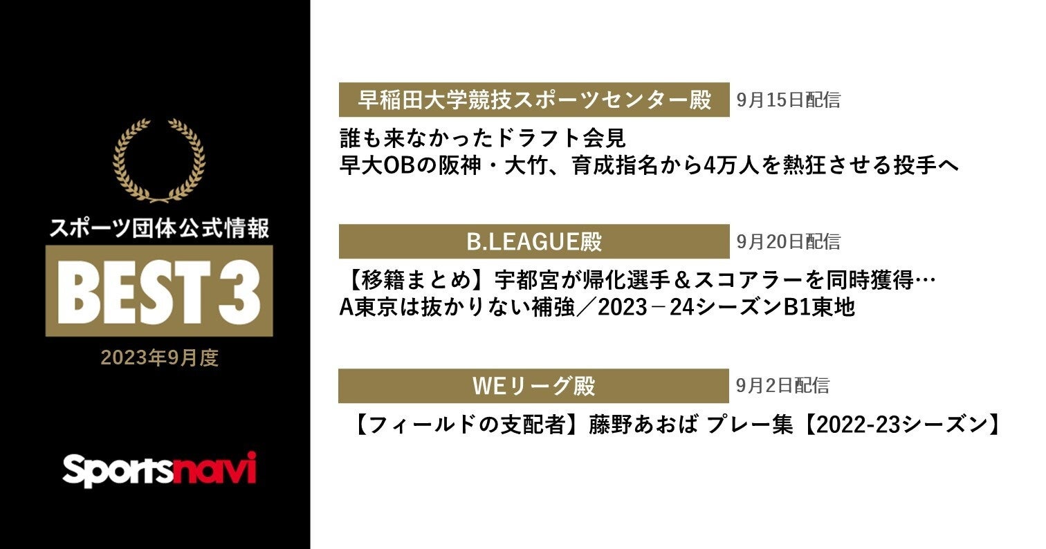 スポーツナビでは毎月、公式情報記事・動画配信において最も印象的だった記事・動画3つを選定し、「スポーツ団体公式記事・動画 月間ベスト3」と称して表彰させていただいております。