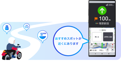 当社が開発した「MOTTO GO」β版は、バイク向けに最適化したきめ細かいナビゲーション、ツーリングを安心・安全に楽しめる情報をプッシュ型で提供するバイク用音声ナビです。渋滞・天気、急カーブ地点といった走行中のリスクや不安を軽減する情報や、付近の観光スポット/景観スポットを通るルートなどツーリングの楽しみを広げる情報を、スマホを操作することなく音声で通知し、ライダーへ新しい価値体験を提供します。