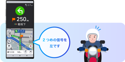 排気量区分別のルート検索のほか、信号数のカウントや右左折ポイントなどの交差点情報を、分かりやすい音声案内とシンプルで見やすい矢印で表示し、快適なライディングをサポートします。