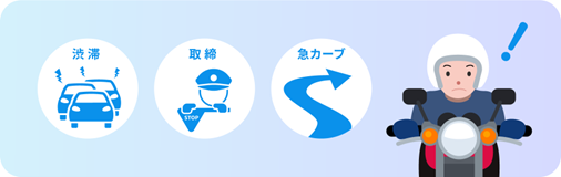 走行中の渋滞・天気(現在地、目的地)・取締地点情報や、急カーブ・未舗装路などの注意ポイントをお知らせします。