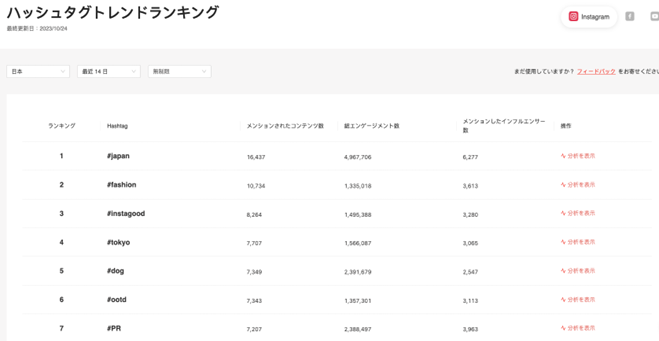 指定期間の間で話題となっているハッシュタグをKOL Radarのプラットフォーム上で表示できるようになりました。無料版でも、トレンドのハッシュタグのトップ10を確認でき、話題となっているハッシュタグをリアルタイムで把握できるようになりました。