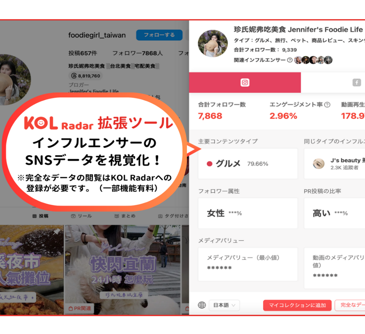 ChromeのKOL Radarの拡張機能をインストールすると、インフルエンサーのSNS投稿のエンゲージメント率がInstagramの画面上で表示されるようになります。また、Instagram、Facebook、YouTubeは、KOL Radarでの基本分析が画面上で確認できるようになります。これにより、該当アカウントのアクティビティを数値で簡単に認識できるようになり、KOLのリサーチにかかる時間を短縮します。日本語、中国語、英語の3言語に対応しており、リリースから1カ月でインストール数は増加し続け、デイリーの利用率は90%に達しています。